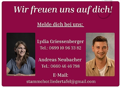 Ab Jänner 2026 werden wir – Lydia Griessenberger und Andreas Neubacher – den Stammchor der Salzburger Liedertafel „reloaded“ musikalisch leiten. Als leidenschaftliche:r Chorleiter:in und Musikpädagog:in starten wir mit frischer Motivation durch und freuen uns auf viele neue Sänger:innen. Wir setzen auf eine bunte, lebendige Gemeinschaft, in der jede Stimme zählt.