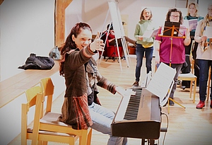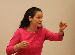 Sonja Prugger entführte die Sängerinnen und Sänger mit ihrem musikalischen Temperament und ihrer mitreißenden Energie einerseits in die Welt des durch groovige Rhythmen sowie poppige Sounds und Songs geprägten Chorgesangs. Darüber hinaus machten die Teilnehmenden in ihrem Workshop „Rhythmus im Chor“ erste Erfahrungen mit kurzen Stücken, bei denen perkussive Elemente – erzeugt durch Bodypercussion – im Mittelpunkt stehen und asynchrones, gleichzeitiges Stampfen, Klatschen und Sprechen trainiert wird.