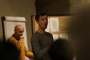 Ich nahm meine Stimmbildungseinheit schon am zweiten Tag. Mit Hilfe von Kevin, meinem ausgewählten Stimmbildner, erkundete ich als tiefer Bass die Höhen meiner Baritonstimme. Ich brauche mehr Stütze, hieß es seinerseits. Jedes Mal wenn ich dachte, ich hätte meine Höchstgrenze erreicht, hatte Kevin eine neue Übung bereit für mich, um mich noch einen oder zwei Töne weiterzubringen. Er meinte, dass ich eigentlich so wie er eine Baritonstimme habe, ich brauche nur die richtige Technik dafür. Die Einheit war zu kurz um noch weiter ins Detail gehen zu können, diese Aussage blieb aber für die Dauer des Seminars und auch danach in meinen Gedanken, und hat sich in den darauffolgenden Wochen mit weiterer Übung auch schon als richtig erwiesen.