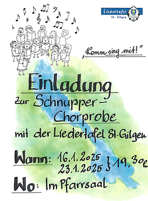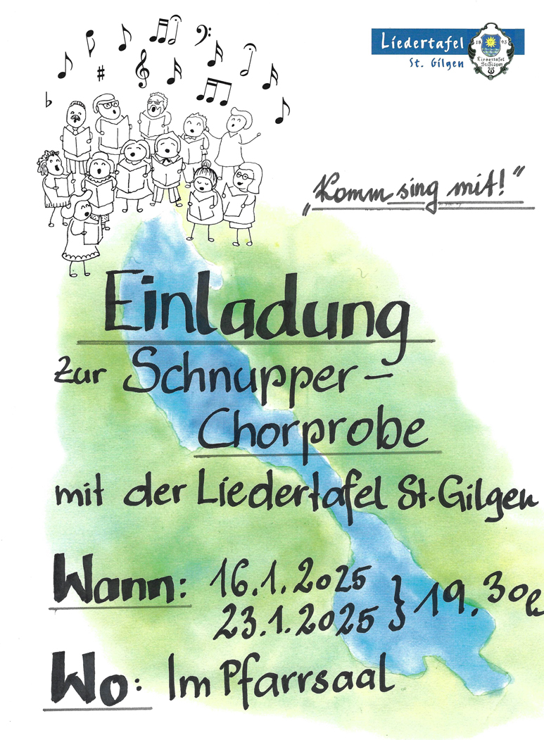 Die Liedertafel St. Gilgen lädt herzlich zur Schnupper-Chorprobe in den Pfaarsaal ein!