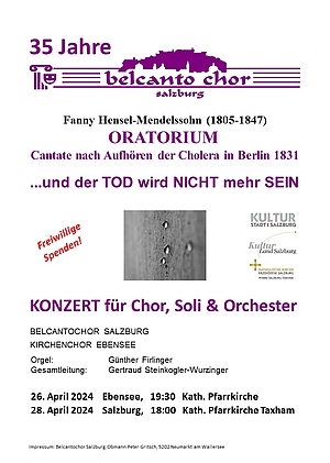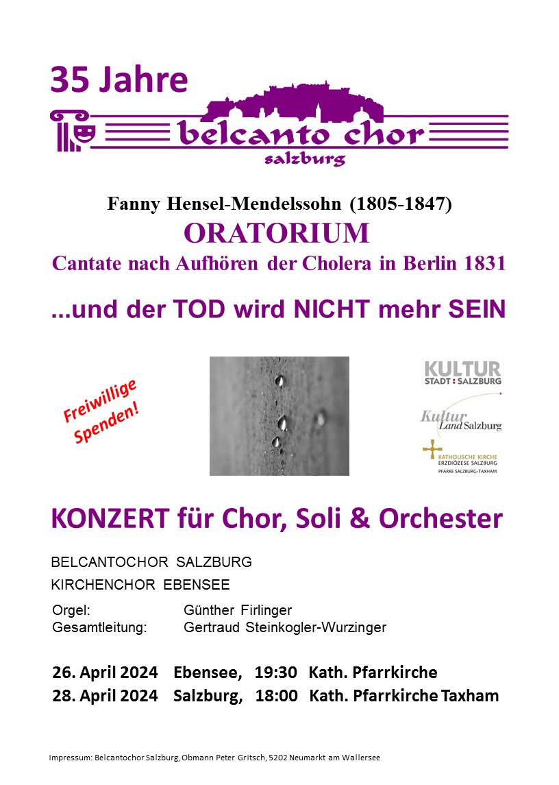 Oratorium von Fanny Hensel-Mendelssohn, Konzert für Chor, Soli und Orchester zum 35-Jahre-Jubiläum des Belcantochors Salzburg