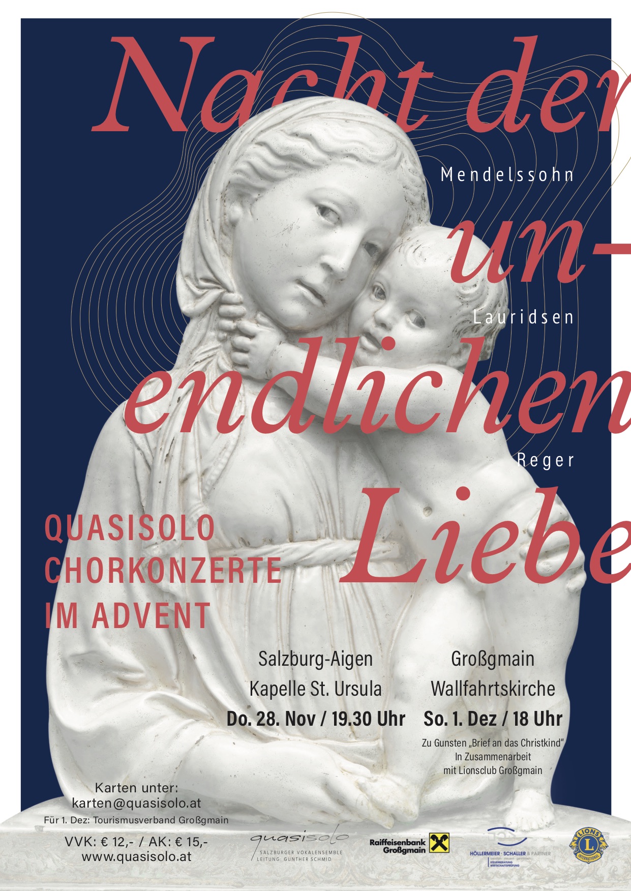 Es war für Chorleiter Gunther Schmid keine einfache Entscheidung, aber mit Ende des Jahres legt er sein großartig ausgeführtes Amt als Chorleiter vom Salzburger Vokalensemble QuasiSolo zurück. Zum Abschluss dieser kostbaren Zusammenarbeit gibt es zwei Weihnachtskonzerte, für die Gunther Schmid noch einmal erlesene und besinnliche weihnachtliche Chorliteratur aus fünf Jahrhunderten ausgewählt hat. Unter dem Titel „Nacht der unendlichen Liebe“ wird er noch einmal feinste Harmonien aus dem Vokalensemble QuasiSolo herauslocken und mit Begeisterung und vollem Einsatz den Taktstock führen.
