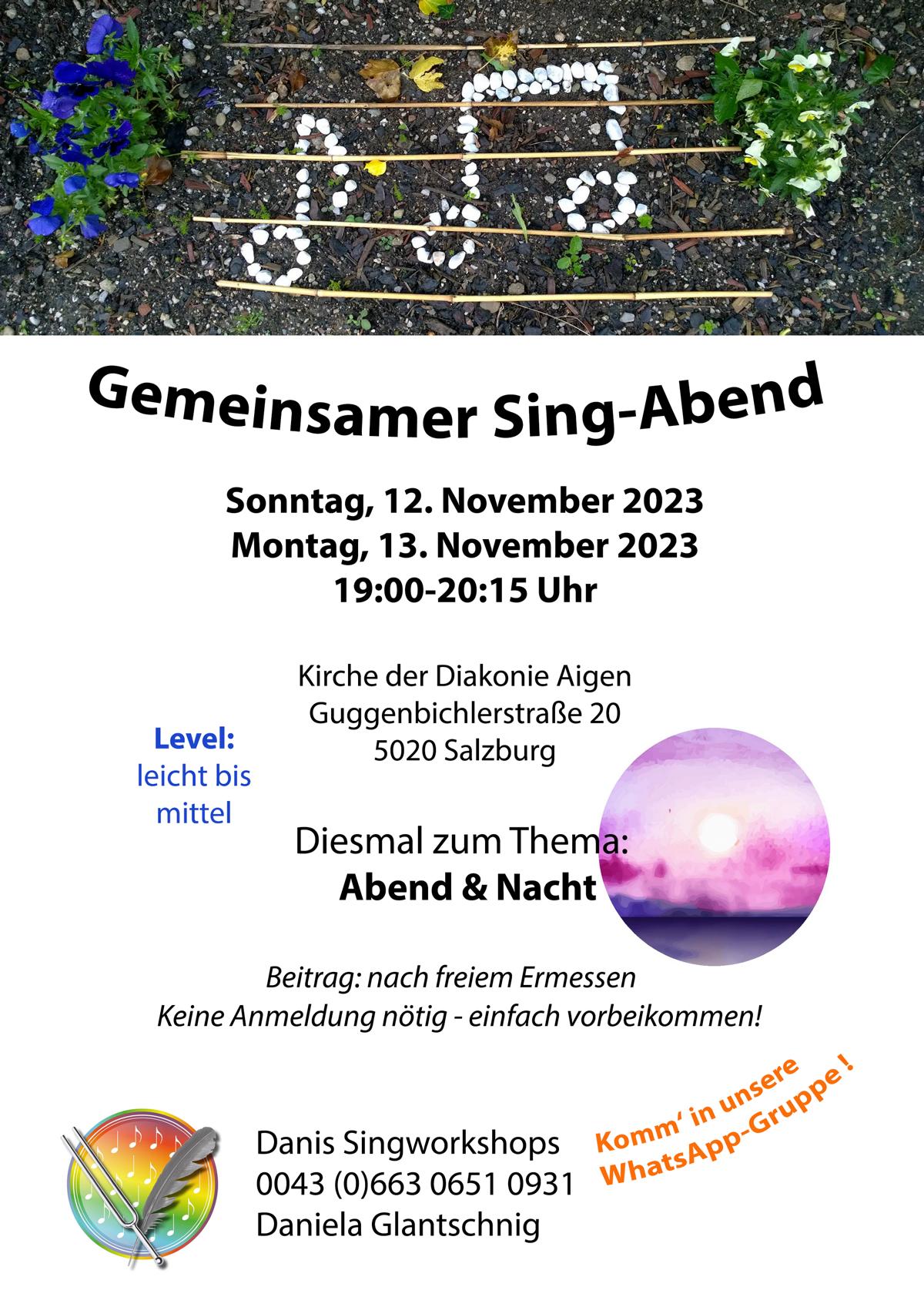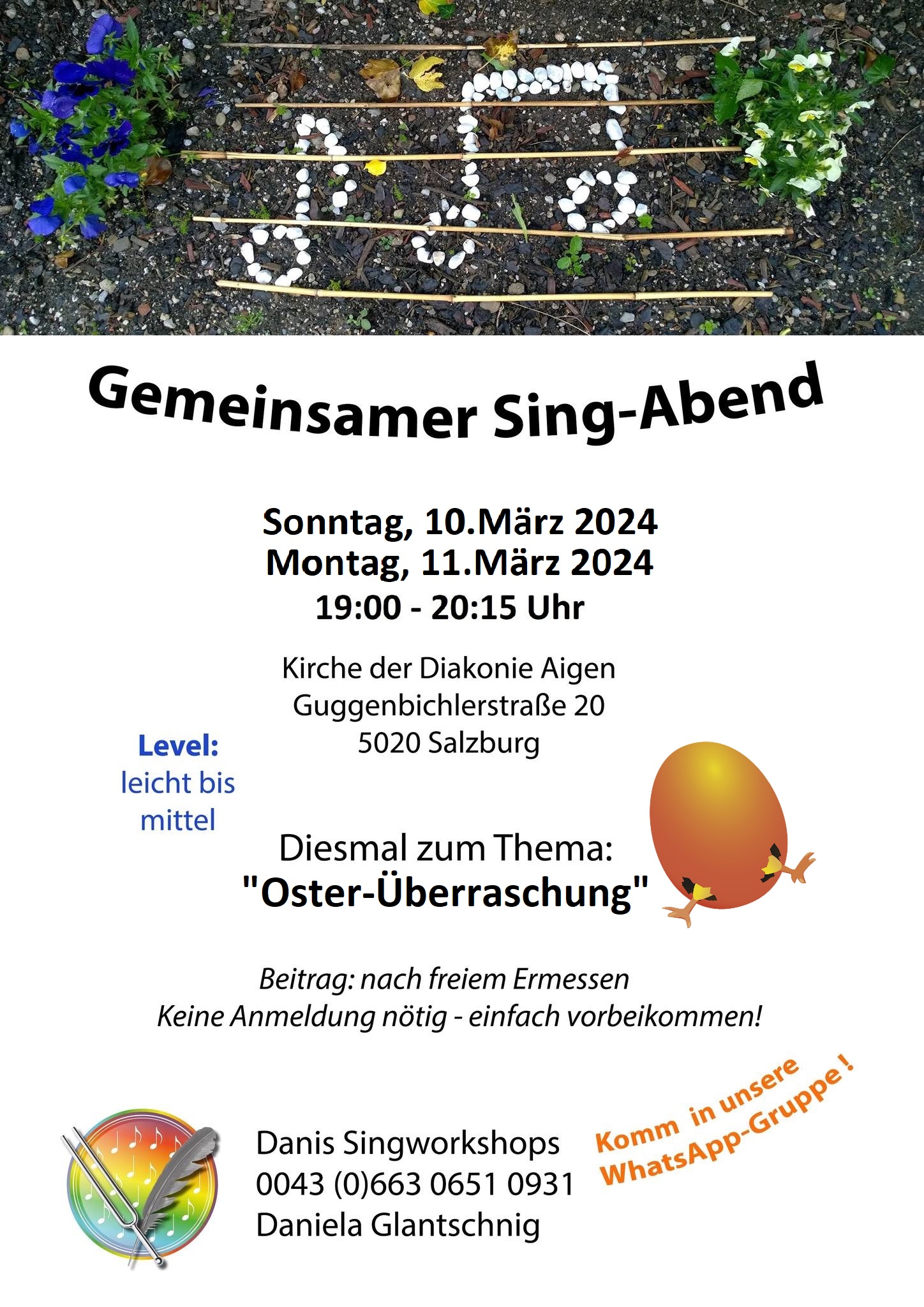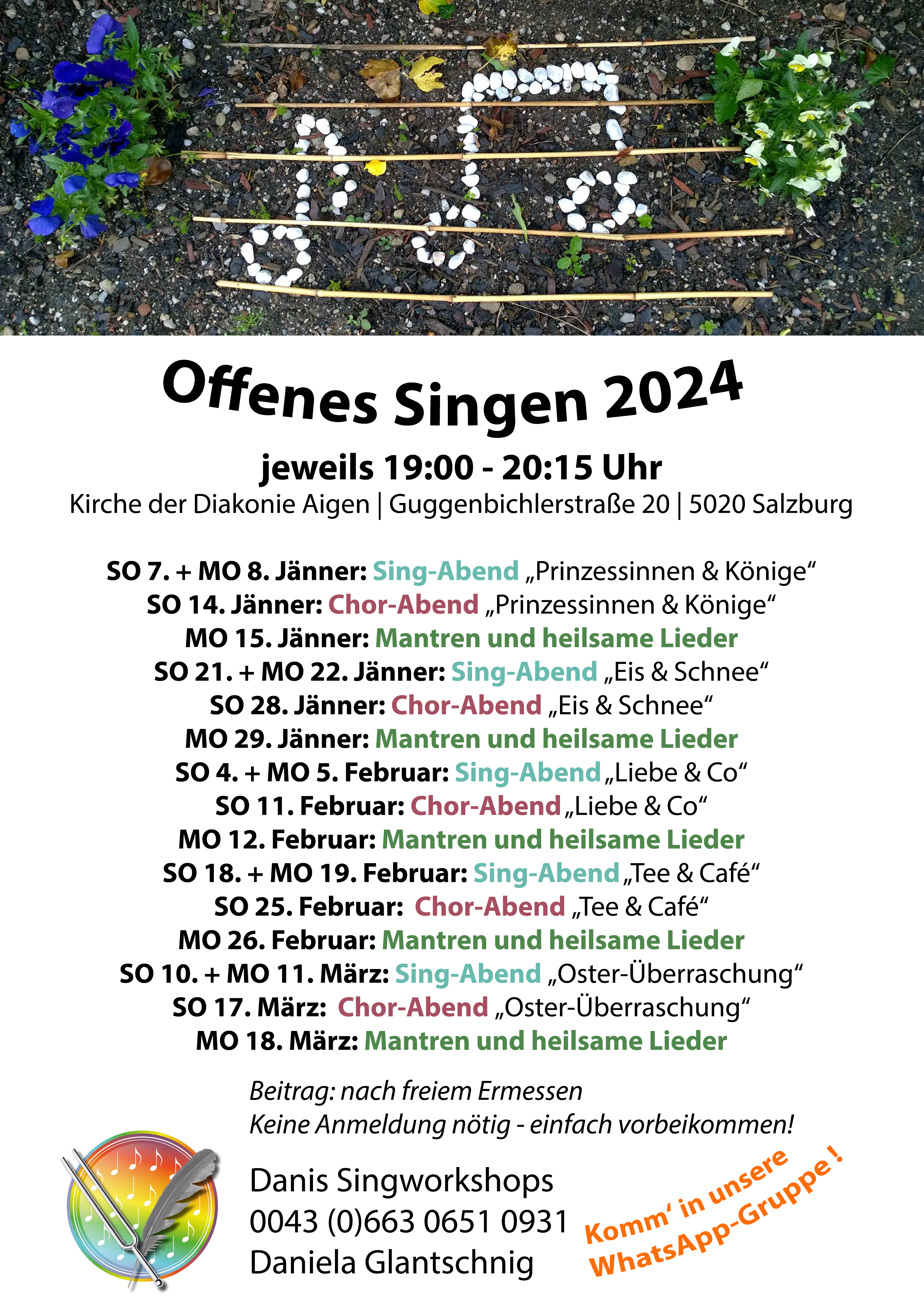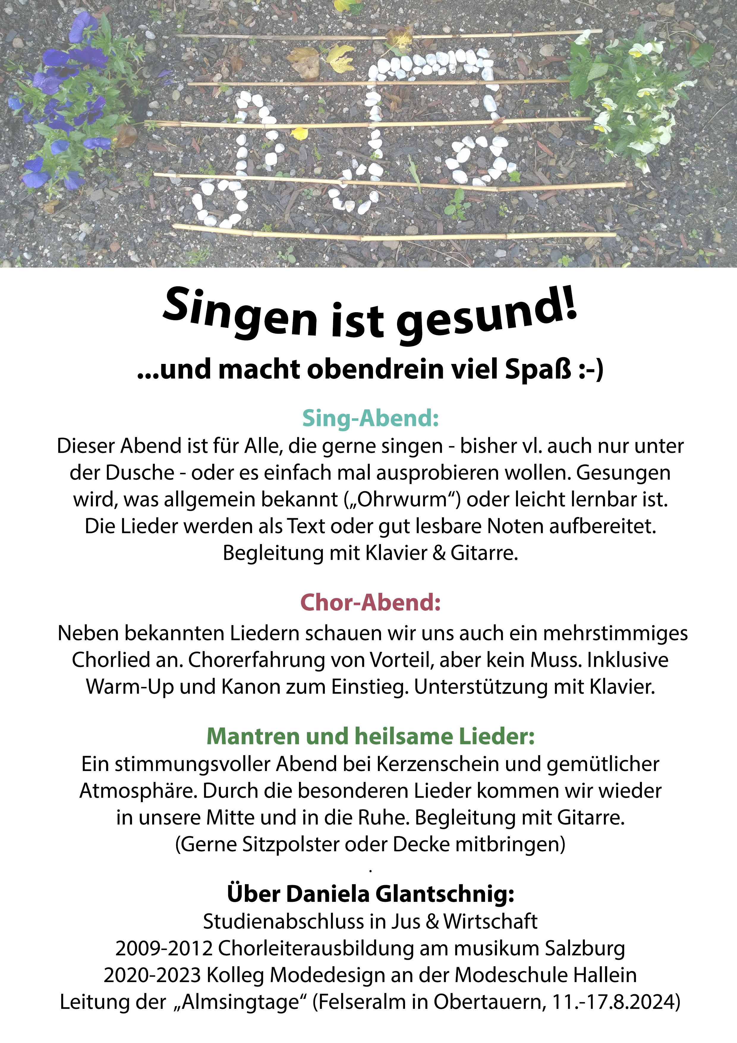Schaut bei Interesse einfach vorbei, es ist keine Voranmeldung nötig. Ich sammle keine Namen ein und versende auch keine Newsletter. Das Singen ist wirklich völlig frei besuchbar. Wer mag, wird gern in die WhatsApp-Gruppe (+43 (0)663 0651 0931) aufgenommen, kann dort Liedwünsche äußern und erhält zeitnah die nächsten Termine. Außerdem werden ausgewählte Lieder aufgenommen und die Audios nach dem Singen in die Gruppe gestellt.