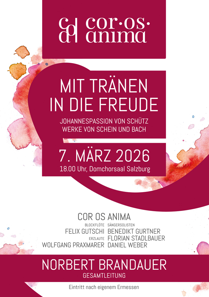 Der CorOsAnima - gemeinsam mit den besonderen Vokal- und InstrumentalsolistInnen - freut sich, dass wir Sie, geschätzte ZuhörerInnen, berühren und in eine wohlige Freude führen dürfen.