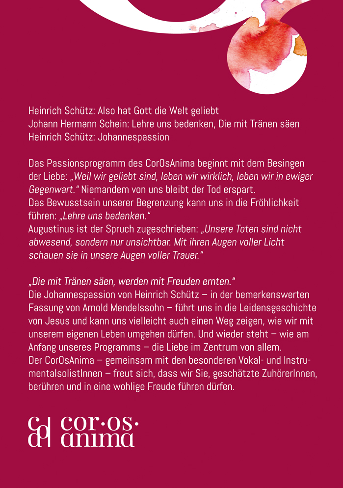Das Passionsprogramm des CorOsAnima beginnt mit dem Besingen der Liebe: "Weil wir geliebt sind, leben wir wirklich, leben wir in ewiger Gegenwart." Niemandem von uns bleibt der Tod erspart. Das Bewusstsein unserer Begrenzung kann uns in die Fröhlichkeit führen: "Lehre uns bedenken."