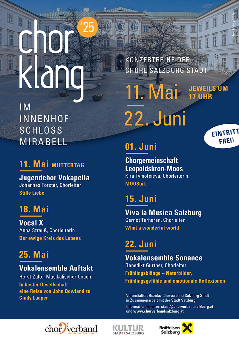Ausgewählte Chöre bieten mit der Konzertreihe "Chorklang im Innenhof Schloss Mirabell" ein hörenswertes und abwechslungsreiches Chorprogramm. Als stimmungsvoller Schauplatz dient der Innenhof des Schlosses Mirabell - Sitz der Salzburger Stadtregierung. Die Konzerte beginnen um 17 Uhr und laden zum Zuhören und Verweilen ein.