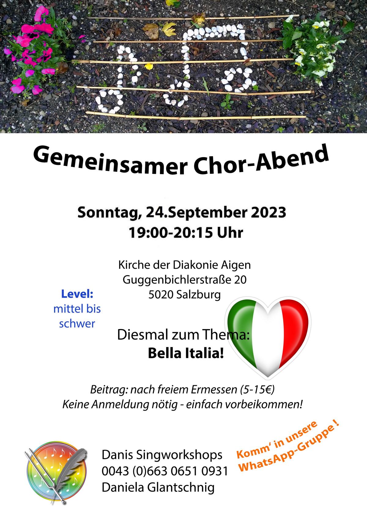 Schaut bei Interesse einfach vorbei, es ist keine Voranmeldung nötig. Ich sammle keine Namen ein und versende auch keine Newsletter. Das Singen ist völlig frei besuchbar. Wer mag, wird gern in die WhatsApp-Gruppe (+43 (0)663 0651 0931) aufgenommen und erhält zeitnah die nächsten Termine. Außerdem werden immer ausgewählte Lieder aufgenommen und nach dem Singen in die Gruppe gestellt.