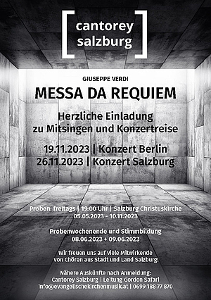 Die Cantorey Salzburg unter Dirigent Gordon Safari lädt herzlich ein zur Teilnahme am Konzert in Salzburg und zur Konzertreise nach Berlin. Möchten Sie Teil einer großen, wunderbaren Reqiumaufführung werden und die einzigartige Klangfülle des Verdi-Werkes selbst mitgestalten und erleben? Dann sind Sie hier genau richtig!