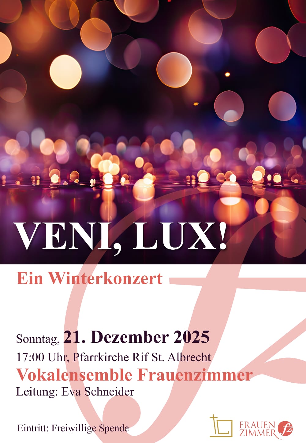 Am 21. Dezember laden wir Sie ein, mit uns die Dunkelheit des Winters in Klang und Licht zu verwandeln. Unter dem Titel „Veni, Lux!“ – Komm, Licht! – präsentieren wir Chorwerke, die das Thema Hoffnung und Licht in der Adventszeit in ganz unterschiedlichen Klangfarben beleuchten.